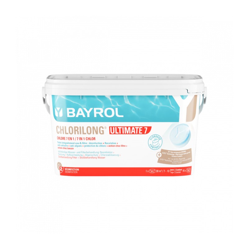 BAYROL Chlorilong ULTIMATE7 – Die ultimative 7-in-1-Chlortablette für kristallklares Wasser und maximalen Poolkomfort! Innovative 2-Phasen-Wirkung kombiniert Tiefenreinigung, Langzeitdesinfektion und Trübungsentfernung für ein perfekt gepflegtes Schwimmbecken.