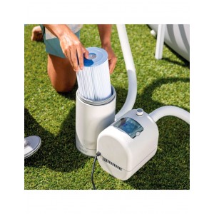 La depuradora INTEX C2500 combina gran capacidad de filtración, eficiencia y facilidad de uso, siendo ideal para mantener grandes piscinas desmontables limpias y cristalinas. Su caudal de 9.463 l/h permite filtrar grandes volúmenes de agua rápidamente, mientras que el cartucho tipo B mejorado retiene eficazmente partículas, hojas y residuos flotantes gracias a su papel reforzado y múltiples pliegues.