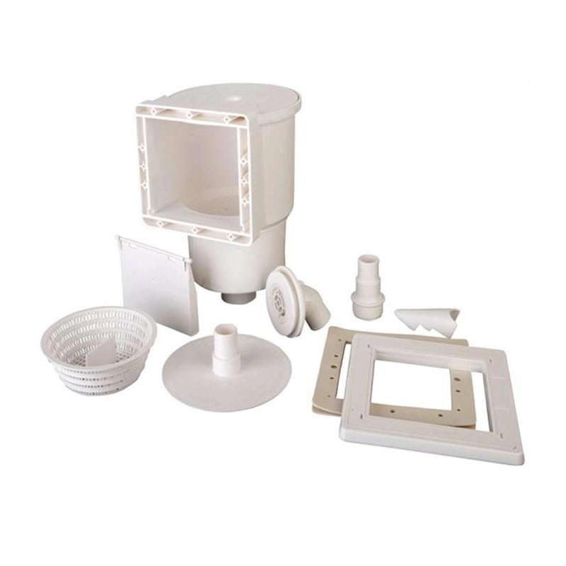 Der Skimmer wird mit Klappe, Korb und oberer kreisförmiger Abdeckung, Rahmenverkleidung für die Befestigung, doppelter Dichtung, Auslassdüse, Deckel zum Anschluss vom Poolreiniger und mit kompatiblen Anschlussstutzen für den Schlauch 32 und 38 mm angeboten.